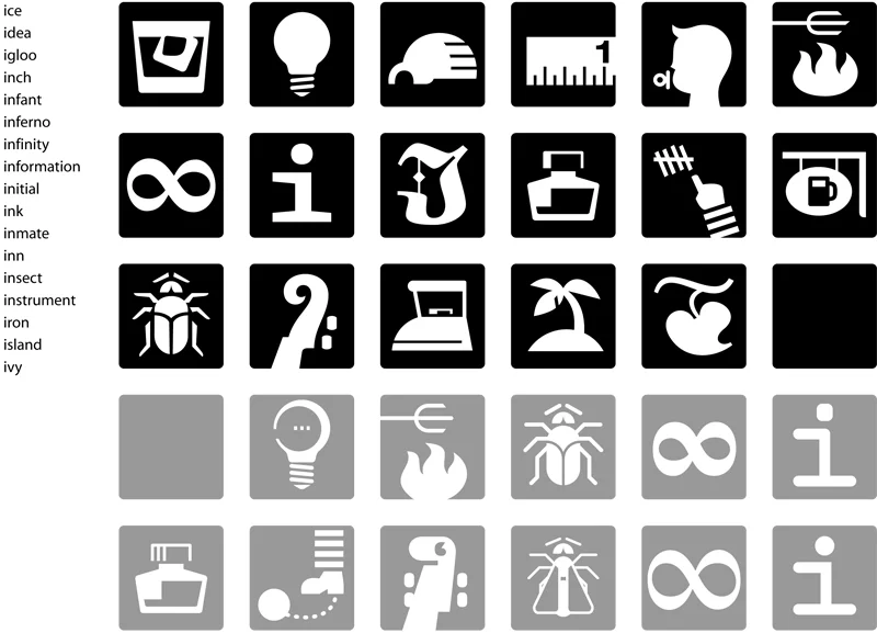 I specialize in pictograms, mascot characters, and typefaces—small things with meaning. While I love bitmaps, it bothers me that pixels have no inherent meaning. My work gives each pixel significance and engages the viewer in a guessing game. I was happy to be assigned the “i” for idea, information etc… One word that’s missing is “icon”—because that’s what all of them are.